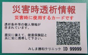 当院では透析中の災害時、緊急避難、怪我人の避難誘導など想定される状況を実際に訓練を行うことで、万が一の災害に備えています。 また他施設で透析を行う場合に備え、透析条件をQRコード化しました。他施設で透析を行うために必要な透析条件をQRコード化し、スマホがあれば必要な条件を読み込むことが出来ます。カードサイズなので携帯に便利で財布等に入れておけば何時でも透析情報が確認できます。